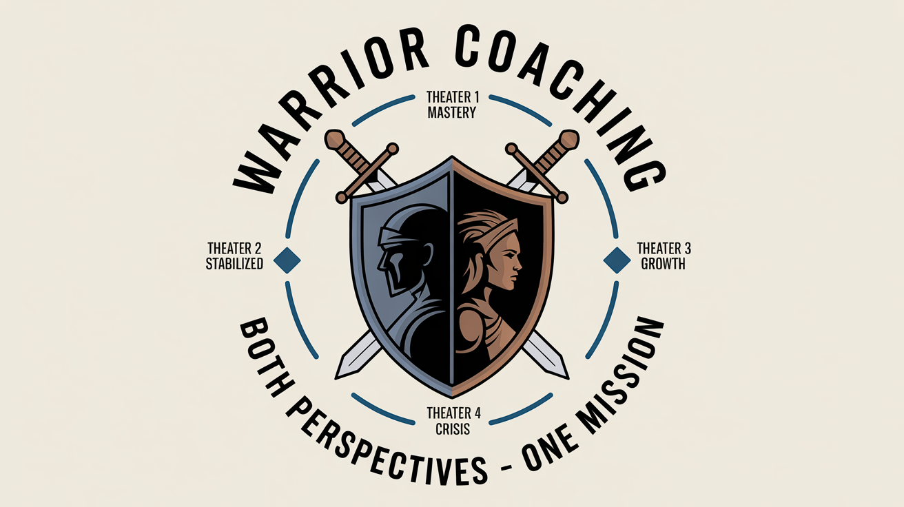 Theater 4 Crisis → Theater 3 Stabilized → Theater 2 Growth → Theater 1 Mastery. Male coaches who've eliminated the patterns destroying you. Female coaches who translate what she's feeling. Both coaching you to transformation.